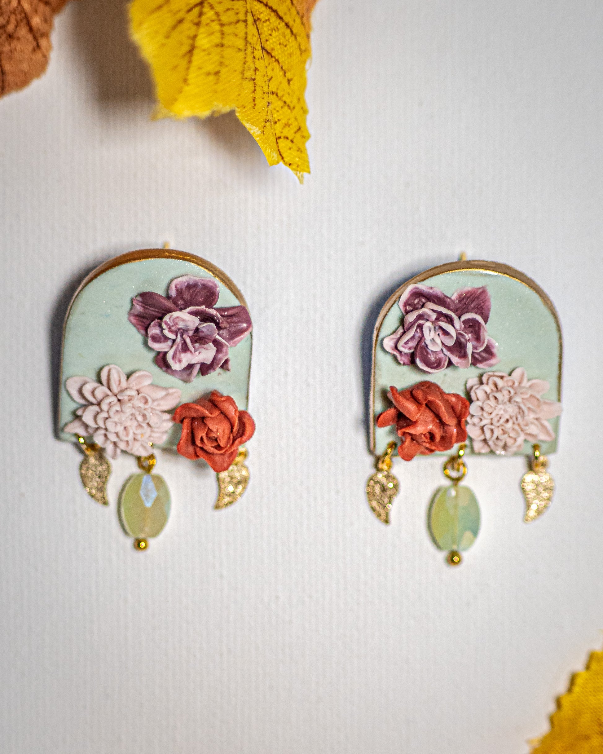 Découvrez les boucles d’oreilles "Lueur Florale", sculptées à la main et réalisées en pâte polymère.