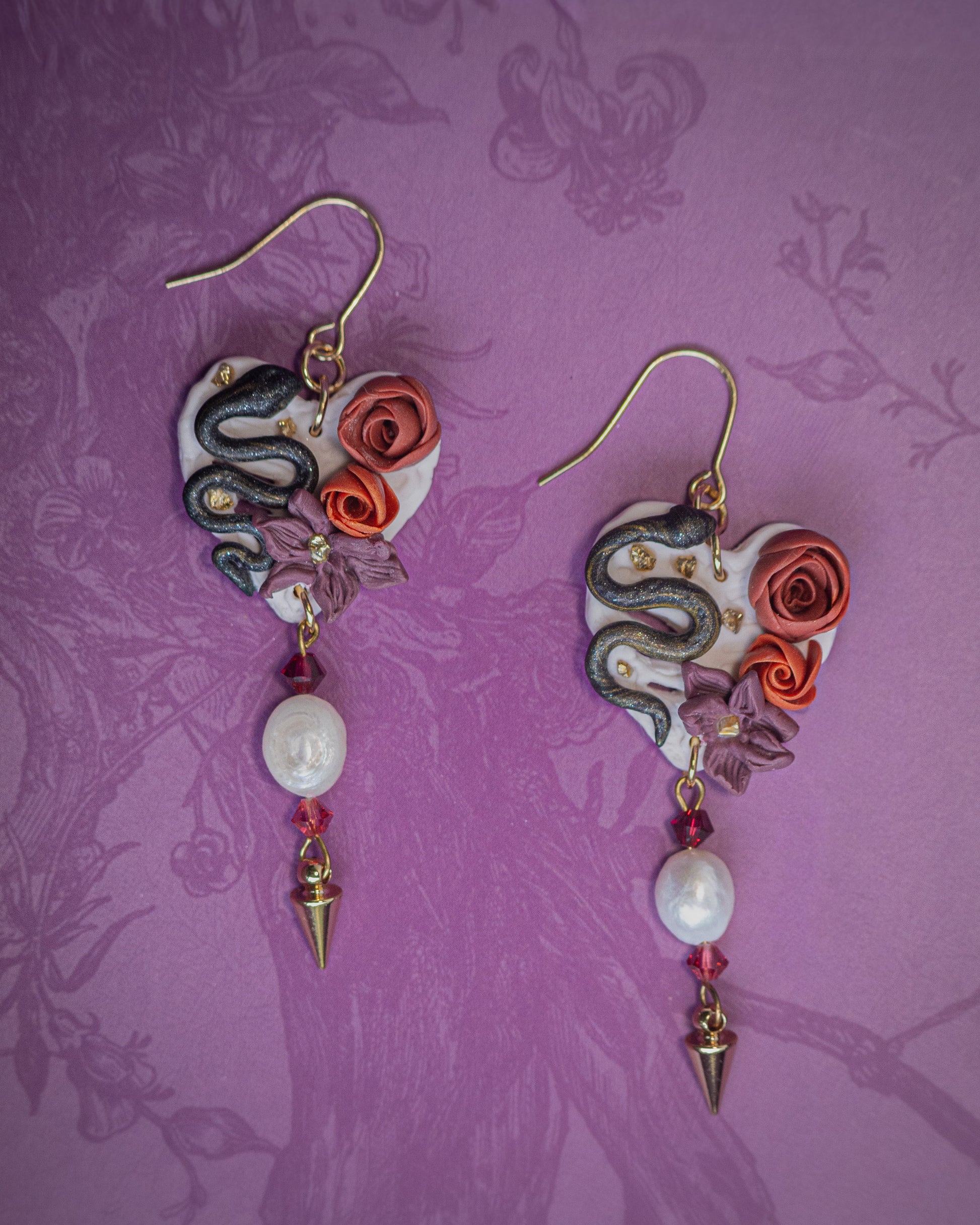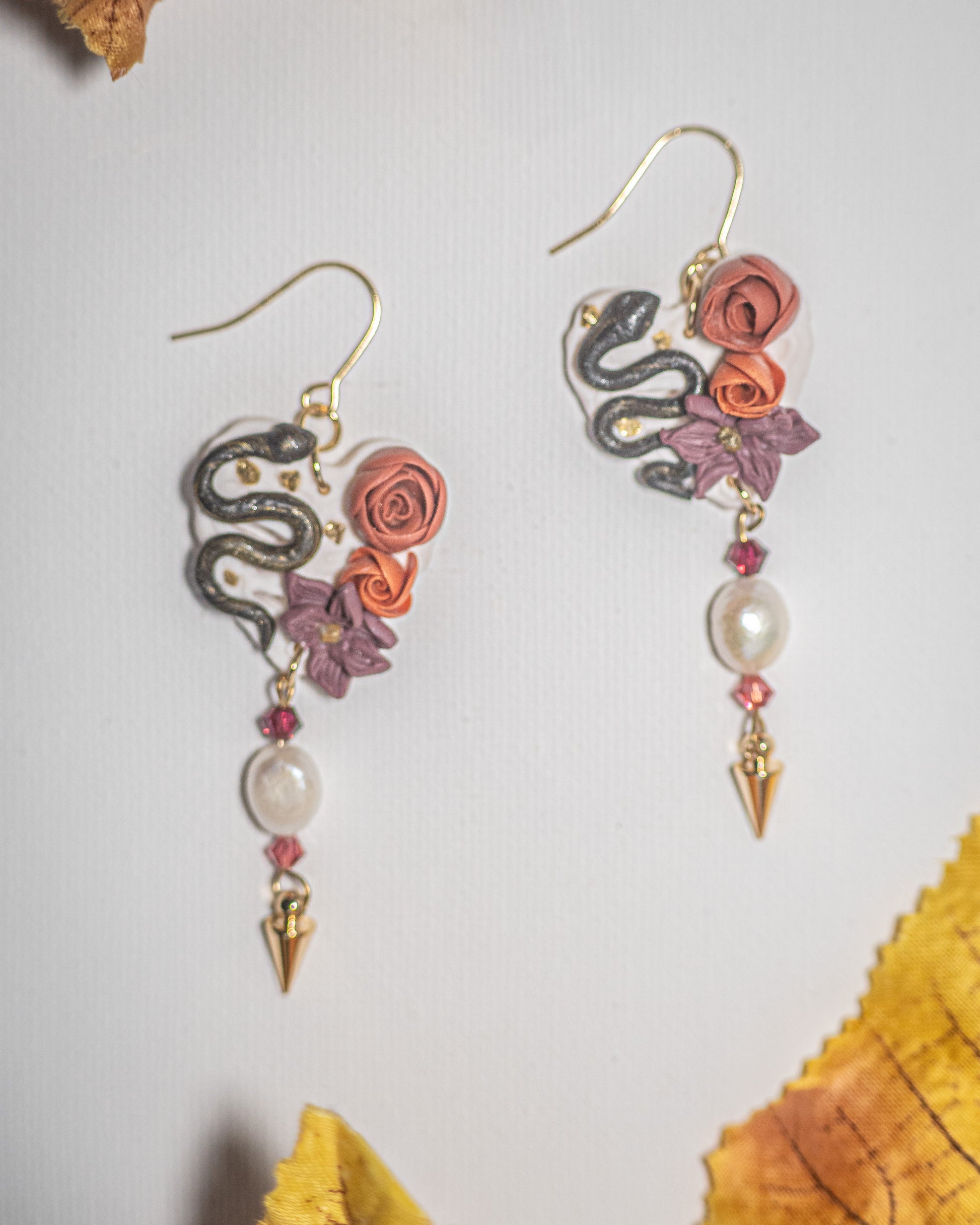 Découvrez les boucles d’oreilles "Etreintes du serpent", sculptées à la main et réalisées en pâte polymère.